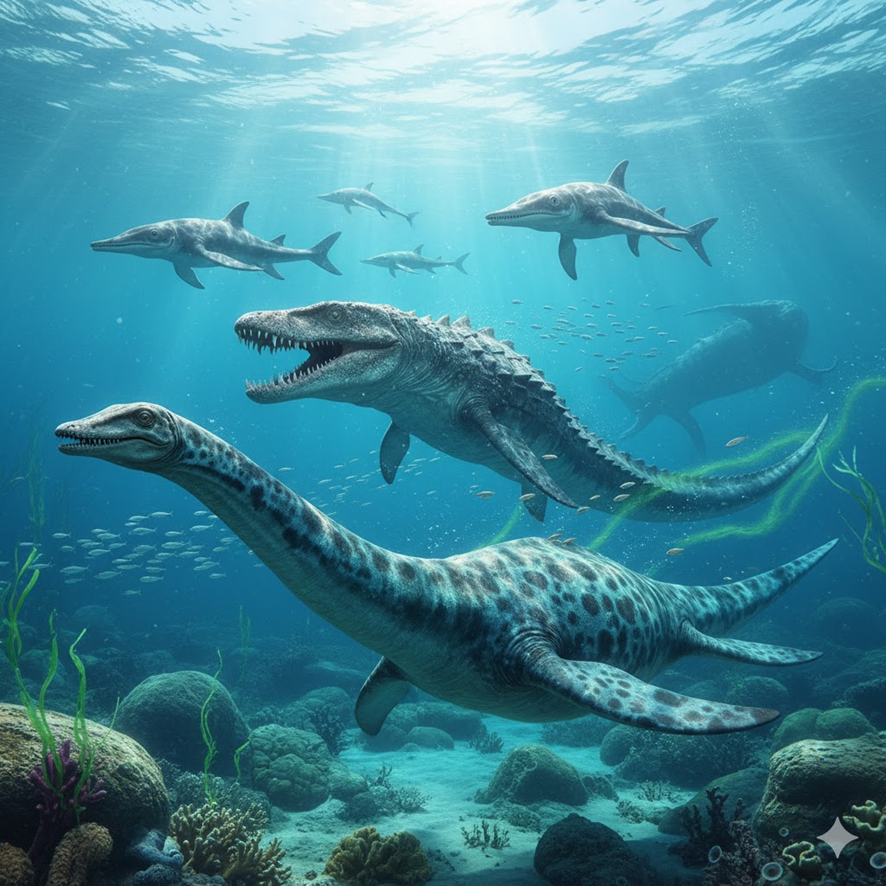 Rei incontestável dos oceanos no final do período Cretáceo, o Mosassauro era um lagarto marinho gigantesco e voraz. Com um corpo robusto e hidrodinâmico, e uma cauda potente, era um nadador rápido e agressivo. Suas mandíbulas maciças, repletas de dentes cónicos e afiados, o tornavam um predador de topo que caçava de tudo, desde peixes grandes e tartarugas marinhas até tubarões. Sua extinção ocorreu junto com a dos dinossauros terrestres.