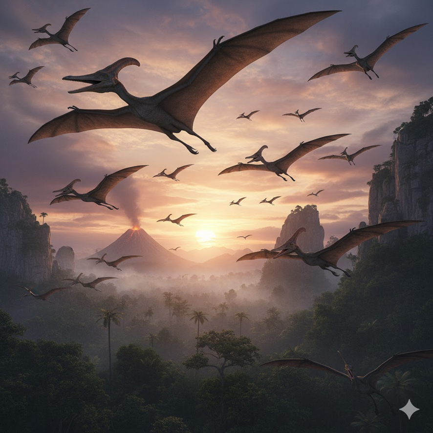 Os céus do período Mesozoico eram dominados por criaturas espetaculares conhecidas como pterossauros, que, embora não fossem estritamente dinossauros no sentido taxonômico moderno, compartilhavam o mesmo período e muitas vezes são referidos popularmente como dinossauros voadores. Representados por uma vasta gama de espécies, como o famoso Pterodáctilo e o gigantesco Quetzalcoatlus, esses répteis alados eram os senhores incontestáveis dos ares. Suas asas membranosas, formadas por uma membrana de pele e músculo estendendo-se do quarto dedo alongado até o corpo, permitiam-lhes realizar voos poderosos e elegantes. Eles planavam sobre paisagens exuberantes e oceanos vastos, com uma visão aguçada, mergulhando em busca de suas presas — desde pequenos insetos e peixes até, em casos de espécies maiores, até mesmo outros vertebrados. A evolução do voo nesses animais é um testemunho notável da adaptação e da diversidade da vida pré-histórica, ocupando um nicho ecológico vital e contribuindo para a complexidade dos ecossistemas daquela era.